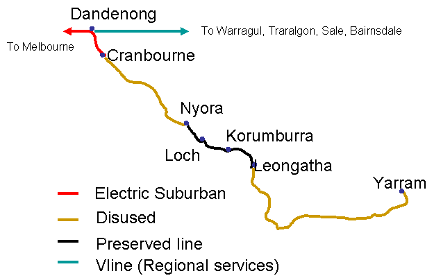 Operates heritage trains along a section of the former Victorian Railways South Gippland line. Current workings running between Leongatha to Loch (Leongatha - Korumburra - Loch).